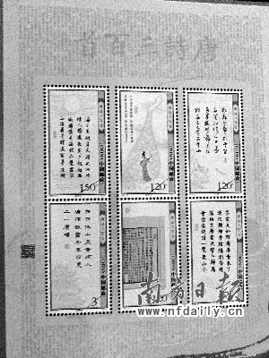 昨日省邮政公司表示,为庆祝共和国成立60周年,弘扬中国传统文化,中国邮政将于本月13日发行“世界上首套多媒体邮票”———《唐诗三百首》(见左图,杨小亮摄)。此套邮票一套共6枚,全套面值9元。