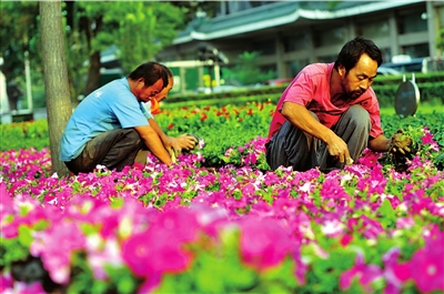 昨天,在交通部对面的绿化带里,20多位园林绿化工人正在修剪枝桠,空地上摆满了小花盘,红黄绿紫,颜色多样,引来众多市民观看。市园林绿化局透露,根据国庆60周年北京花卉景观布置规划,全市将布置各类花卉共达4000万盆。其中,天安门广场将在十一期间设置一组中心花坛,长安街沿线步道将布置22处立体花坛,面积达十万余平米。其中,天安门广场中心花坛作为主花坛,现暂定将安排在天安门中心广场偏南10米的位置,呈圆形,突出“普天同庆”的主题。花坛直径将达40米,中心主花篮高达13米,将选用真假花卉结合的方式,主选花种有粉矮牵牛花、小黄菊等。市园林绿化局负责人表示,主花坛的设计和布置还未最终确定,将在国庆游行排练之后,按实际需要做相应的修改和调整。
