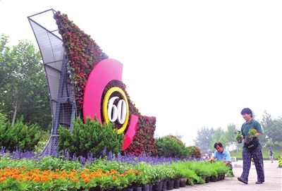 昨天,国庆60周年大型花坛“普天同庆”基本完工,用鲜花等材料构建的“60”及“红旗”亮相朝阳公园东门。这是今年国庆第一个完工的大型花坛,也是城区公园和环线要道最具国庆色彩的花坛。