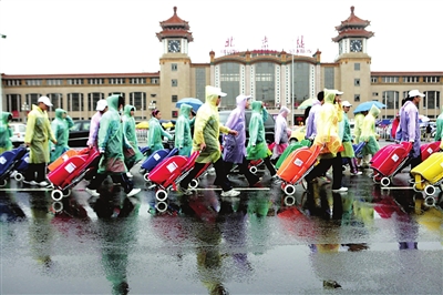在天安门前,每隔8米一个岗哨,每个武警的脚下,都放着一个装着雨衣的布包。下午4点半,因降雨变大,不但武警穿上了深绿色雨衣,长安街沿街的所有音响也都套上了“雨衣”。