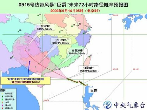 中新网9月14日电 中央气象台今日06时发布台风橙色警报:今年第15号热带风暴“巨爵”(Koppu ,名字来源于日本,指巨爵星座)的中心今天早晨 5 时位于广东阳江东南方大约 480 公里的南海北部海面上,就是北纬20.1度、东经116.2度,中心附近最大风力有9级(23 米/秒)。