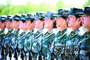 在女民兵方队,队员们训练归来最爱开的一个玩笑,便是撩开“刘海儿”,欣赏各自脑门上那道黑白分明皮肤,互相打趣:“咱们可以给美白护肤产品作‘活广告了’。”