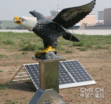 太阳能驱鸟器可以说是高科技驱鸟产品,通过太阳能电池的充电和遥控操纵,使前面的炮筒发射出煤气泡,通过巨大的炮弹声音恐吓鸟类。太阳能驱鸟鹰的工作原理也是类似,通过太阳能充电,使老鹰的翅膀上下摆动,并通过扩音装置把驱鸟鹰中录制的各种动物声音播放出去,闪动的翅膀加上震撼的声音,对鸟类进行视觉和听觉的双重打击。