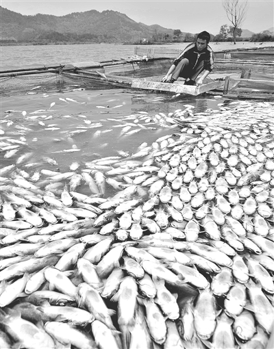 几天前,广西永福县广福乡广福村附近的河水突然变黑,导致近日村里11户农民在河中网箱内养的鱼接连出现大面积死亡,损失惨重。村民们反映河水变黑是上游几家工厂偷排污水所致。目前,当地环保、渔政等部门已介入调查。