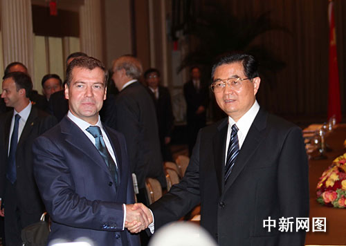 梅德韦杰夫说,一年之内,这已是我们第四次会面,非常高兴能够再次与胡锦涛举行会见。