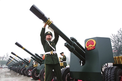 当天上午9时30分,武警北京总队某部京郊某训练场。秋雨刚过,训练场上的60门礼炮(其中4门为预备炮)着新刷不久的绿漆,雁翅分开,昂然而立。9时40分左右,“就炮!”随着一声口令,百余名武警战士两人一组站到礼炮后面。