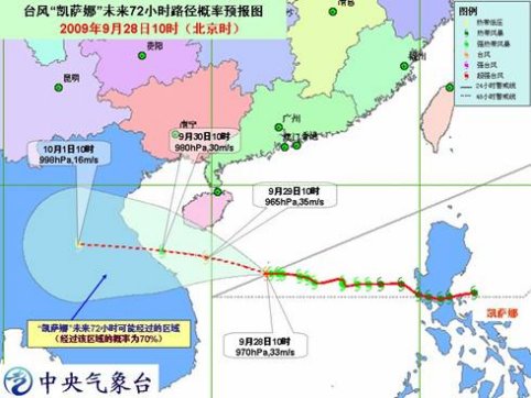 受“凯萨娜”及其外围云系的影响, 28 日中午到 29 日中午 ,南海大部海面、北部湾海面、海南沿海、琼州海峡将有 7~9 级大风,“凯萨娜”中心经过的附近海面的风力将有 10~12 级大风,阵风可达 13~15 级;巴士海峡、巴林塘海峡、台湾海峡、台湾以东海面、广东沿海、福建中南部沿海、广西沿海也将有 6~7 级大风,阵风可达 8~9 级; 浙江东部沿海、福建东部沿海、台湾南部、广东南部、海南大部有大雨或暴雨,海南东部的局部地区有大暴雨。