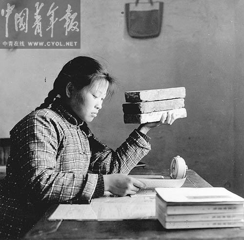 1965年5月3日,共青团上海市委在上海青年纪念五四运动46周年大会上,授予上海宝山县吴淞公社城中大队基干民兵连“上海市红旗青年突击队”光荣称号。图为女民兵班副班长何金英看书时,也不忘锻炼手劲。