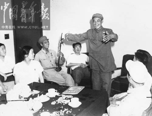 1954年5月,志愿军回国官兵代表应邀到报社座谈。会后,代表们为大家唱歌表演。