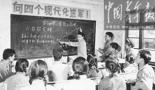 1978年12月14日,本报刊发了《为四个现代化贡献青春》的报道。兖州煤矿机械厂的青年充分认识到四个现代化所赋予自己的重任,刻苦学习科学技术和文化知识。这是机修车间团支部委员黄洪志在给本车间的青年上数学课。 记者 王裕量摄