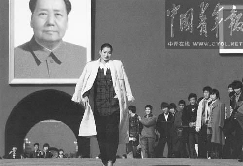 1988年11月24日,模特彭莉在北京天安门金水桥上展示风采。三个月前,彭莉在意大利举行的“今日新模特”大赛中脱颖而出,成为新中国历史上第一位国际模特大赛冠军。 记者 刘占坤摄