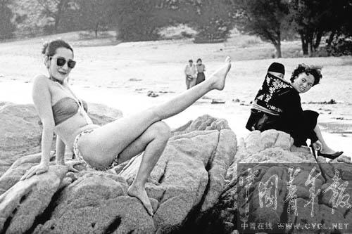1992年12月13日,广东珠海,一名模特在海边展示姿容,她身旁的一位农村妇女大惑不解。 记者 贺延光摄