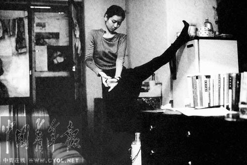 舞蹈家杨丽萍在家中练功。 记者 郑鸣摄