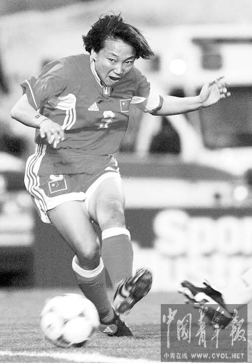 1999年6月23日,中国女足运动员孙雯在美国女足世界杯上射门。她效力的中国女足获得过世界杯和奥运会的亚军。记者 刘占坤摄