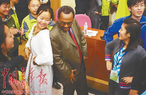 2006年10月28日,中国援非青年志愿者同埃塞俄比亚驻华大使海尔·基洛斯一同翩翩起舞。 记者 赵青摄