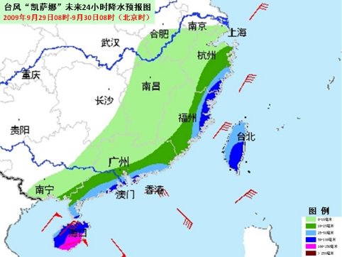 受“凯萨娜”及其外围云系的影响,29日白天到夜间,南海大部海面、北部湾海面、琼州海峡、海南沿海、广西沿海将有7~9级大风,“凯萨娜”中心经过的附近海面或地区的风力将有10~13级大风,阵风可达14~16级;巴士海峡、巴林塘海峡、台湾海峡、台湾以东海面、广东沿海、福建中南部沿海也将有6~7级大风,阵风可达8~9级;浙江东南部、福建东部、台湾、广东南部、海南等地有大雨或暴雨,海南南部的局部地区有大暴雨或特大暴雨。