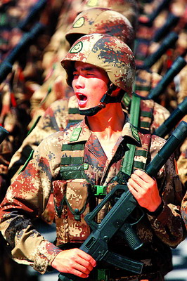 在雄壮的军乐声中,三军仪仗队作为第一个方队踏着整齐的步伐走了过来。当各方队行进至模拟的天安门城楼前时,铿锵的正步声振奋人心。一张张朝向城楼的脸上眼神坚毅而高昂。坦克方队、履带战车方队、巡航导弹方队,一辆辆匀速行进的车辆装载着无数人的期盼与自豪。
