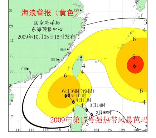 中新网10月5日电 国家海洋局东海预报中心根据《风暴潮、海浪、海冰和海啸灾害应急预案》发布海浪Ⅲ级警报(黄色)。