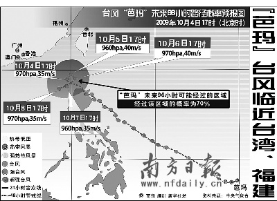 虽然“芭玛”5日将继续在南海东北部回旋少动,强度变化不大,但由于明天是农历八月十八,天文大潮受“芭玛”和南下冷空气的共同影响,5日白天至夜间,巴士海峡、巴林塘海峡、台湾海峡、南海东北部和中部偏东海域及台湾恒春半岛将有7~9级大风,部分海域和地区阵风可达10~11级,“芭玛”中心经过的附近海域的风力有10~12级,阵风可达13~14级;东海、台湾以东洋面、台湾省沿海(除恒春半岛外)、浙江沿海、福建沿海、广东东部沿海也将有6~8级大风,部分海域或地区阵风可达9~10级;台湾大部将有大到暴雨,其中台湾东北部和台湾恒春半岛的部分地区有大暴雨。