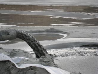 北洺河铁矿尾矿排到了什么地方?记者追踪调查,在武安市上团城乡高村村北的北洺河道里找到了答案。在河道边的河滩上,布满一道道用尾矿渣堆积围成的高高的堤坝,一条矿管道正在向坝里汩汩喷涌着灰白色的尾矿浆。