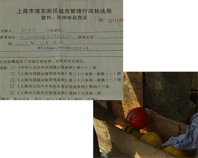 张军说,在这辆面包车上,他收到了一张以涉嫌无证运营擅自从事出租汽车经营为理由的《车辆暂扣通知单》,按照相关条例被处以罚款一万元。处罚他的上海闵行区交通行政执法大队声称,他们掌握有录音证据,证明张军和那名男子谈过车费的问题,而这正是他们处罚张军的依据。但张军告诉记者,当时那名男子上车后曾多次表示要给他钱,但都被他回绝。