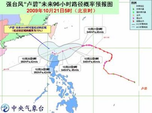 “卢碧”的中心21日5时位于菲律宾马尼拉东北方大约940公里的西北太平洋洋面上,就是北纬20.4度、东经127.6度,中心附近最大风力有14级(45米/秒)。