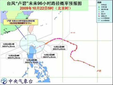 “卢碧”的中心22日5时位于菲律宾马尼拉东北方大约650公里的西北太平洋洋面上,就是北纬19.1度、东经125.1度,中心附近最大风力有13级(40米/秒),中心最低气压为955百帕。