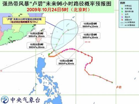 中新网10月24日电 中央气象台24日6时发布台风预报:今年第20号强热带风暴“卢碧”的中心24日5时位于我国台湾省台东市南偏东方大约440公里的西北太平洋洋面上,就是北纬20.4度、东经124.6度,中心附近最大风力有11级(30米/秒),中心最低气压为980百帕。
