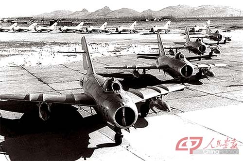 新中国生产的第一种喷气式战斗机——歼-5,1956年7月首飞成功。1956年10月1日,4架歼-5战斗机参加庆祝中华人民共和国成立七周年庆典,从天安门上空飞过。1959年下半年停产,共生产767架。