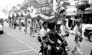 10月25日早晨,朝霞鲜艳。在东阳社区,村民们忙着将条幅、锣鼓、金龙和戏装搬上农用车,他们的目的地———县城最繁华的潇水南路。