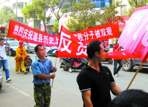 在奉开顺舞龙的同时,月岩中路上,周加花和邻居们也打起了“反贪反腐”的条幅,沿街道向东前进。