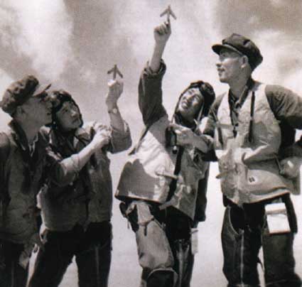 突然,“叮叮叮……”指挥所与休息室的直通电话急促地响了。指挥所命令宋义民等四机进入一等。飞行员奔向各自的飞机。随着一发绿色信号弹升起,四架飞机象离弦的利箭,吼叫着腾空而起,直往东南战区飞去……