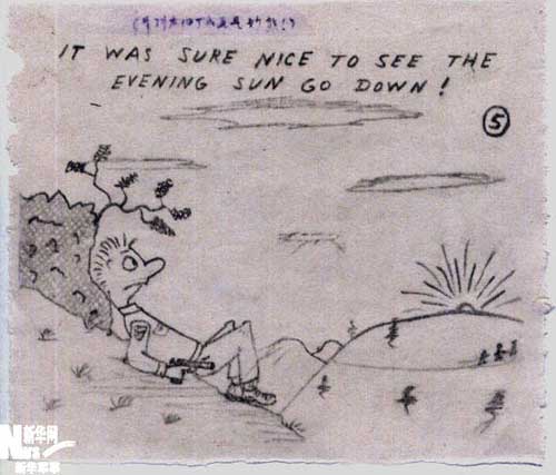美国飞行员科尔中尉被中国军民营救过程的自画漫画