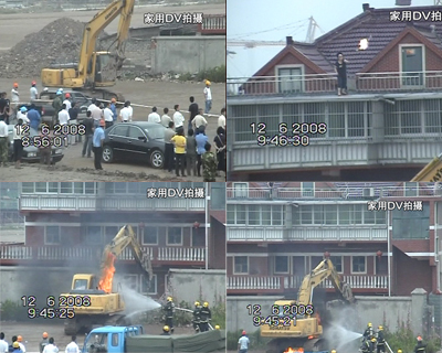 九点,潘蓉家的大门被推土机凿开,拆迁人员进入楼内,要把潘蓉一家清除出楼房实施拆迁,但是由于潘蓉家里一二层用于出租,三四层还有一个防盗门,所以拆迁人员到了三层以后没法上楼,双方隔着门开始叫喊,地面的人开始向四楼扔石块。气氛也变得越来越紧张。9点15分,挖土机开始凿房屋的外墙,楼下的阳台被机器手拍断,部分墙壁开裂并且倾斜。