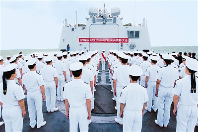 绶带映红碧波,掌声响彻大洋。今天(当地时间11月25日)下午4时,中国海军第三批护航编队“火线立功和护航尖兵表彰大会”在“舟山”舰飞行甲板举行。