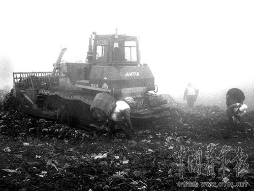 “看后面!”站在填埋场边上的张林突然叫了一声。一名小伙子赶紧跳开,推土机从他原来站立的地方轰轰开过。