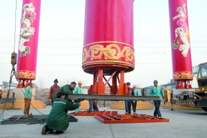民族团结柱的生产和安装都由住总钢结构公司负责。昨日下午,东四环外窑洼湖桥附近的住总钢结构公司厂区内,一条较宽的道路两旁已经竖立起了30多根民族团结柱,还有一些民族团结柱正从运输车上卸下安装。