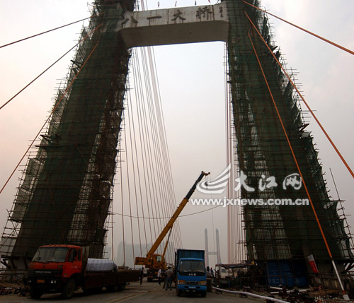 7日下午,记者来到南昌八一大桥上看到,南桥塔上原本搭建的40多层支架目前已剩下15层。施工人员告诉记者,目前,八一大桥的施工只剩下两支架的拆除和铺设沥青了。如果天气晴好,这些支架还需要两天便可全部拆除。