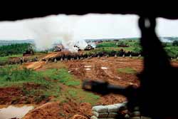 演习进入实弹战术阶段,红方坦克在弥漫的硝烟中冲锋陷阵、动中组网、火力突击;空中,武装直升机从看台西侧穿云破雾,呼啸而来,时而低空突击,时而拉起、俯冲,数发炮弹拖着长长的火焰直射蓝方阵地,蓝方数辆坦克趴窝,多个火力点瞬间开花……
