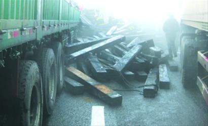昨日上午11时35分,当时京沈高速北京方向536—539公里,大雾弥漫,能见度只有5米左右,一辆拉着木头的大货车追尾到前面拉着木头的大挂车后部,巨大的冲力将前面车尾部撞毁,车上的木材堆满公路,这两辆大货碰撞后,立即将公路封死,后面不知情的车辆继续向前高速行驶,导致两小时内40多辆车接连相撞,在距离追尾大货十几米的地方,一辆紧急刹车的吉普车撞到了高速的隔离带上,车上有5人被困,司机受伤严重。