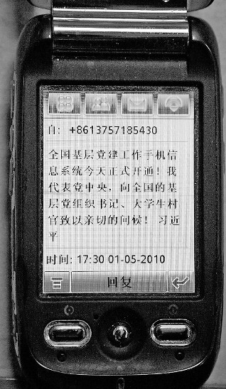 全国基层党建工作手机信息系统昨正式开通,习近平向全国100万名基层党组织书记、大学生“村官”发出问候短信。系统收集汇总了全国100万名基层党组织书记、大学生“村官”及省、市、县党委组织部长手机号码,通过手机短信互动,实现了中央组织部、省区市党委组织部与基层党组织书记、大学生“村官”之间快捷、及时、双向、安全的联系沟通,是运用现代化手段加强党的建设的一项新举措。