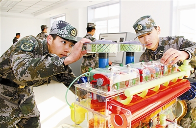 还没走进机电模拟教室,就听到机器的轰鸣声。频闪的指示灯,机电兵忙碌的身影,一下子让记者感受到了紧张的训练气氛。