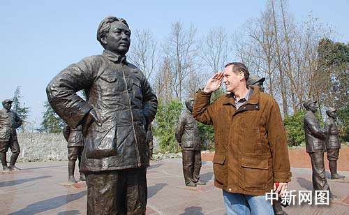 美国驻华武官一行参观了建川博物馆聚落内的中国壮士群雕广场、援华美军博物馆、正面战场馆及汶川大地震博物馆。参观中国壮士群雕广场时,葛百礼还向毛泽东的雕塑致敬。