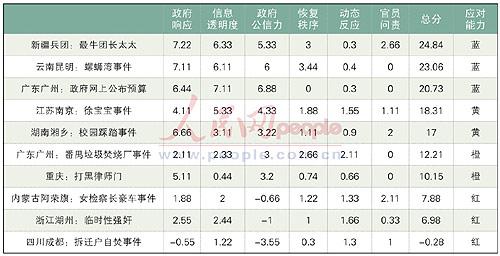 人民网舆情监测室从100多家境内外报刊的新闻报道和评论,8家门户网站的新闻跟帖,约30家论坛/BBS,400余名网络“意见领袖”博客,以及微博客、QQ群和播客网站中,梳理出了2009年第四季度十件“舆情热点事件”,并按照“政府响应、信息透明度、政府公信力”3个常规指标,以及“恢复秩序、动态反应、官员问责”3个特殊指标,对2009年第四季度十件“舆情热点事件”的政府应对、处置能力做出了评估,结论是: