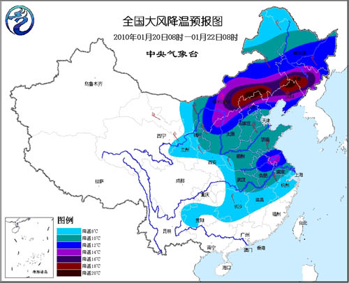 20日14时至22日14时,西北地区东部、内蒙古大部、华北、东北、黄淮、江淮、江汉、江南北部、贵州等地自西向东、自北向南将先后有4~6级、阵风7级偏北风;上述地区的气温将下降8~12℃,其中,内蒙古中东部、华北北部、东北地区中南部、江淮东部等地降温幅度可达14~16℃,内蒙古中部、东北地区东南部的部分地区降温达18~20℃。