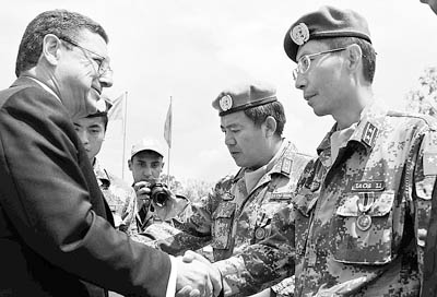 当地时间昨天中午,中国第十批赴刚果(金)维和医疗、工兵分队联合举行盛大仪式接受联刚团授勋。联刚团最高官员、联合国秘书长潘基文特别代表阿兰多斯专程从金沙萨赶到布卡武的中国半岛,亲手为中国维和官兵颁授联合国和平勋章。据悉,这种联刚团最高规格的授勋仪式,在布卡武任务区各国维和分队中尚属首次。中国驻刚果(金)大使吴泽献和武官毕京三也从刚果(金)首都赶来参加这一仪式。