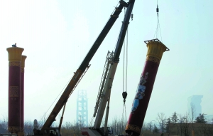 10点半,吊车首先将民族柱的水泥墩安放在钢板上,然后将柱体吊起,对接在水泥墩上,并进行固定,将民族柱的冠顶安装在柱体上。每根民族柱安装约20多分钟。