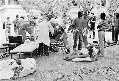 随后,侯世科召集医疗队员布置任务。队员被分成两组,一组负责联海团总部大楼救援现场的医疗保障,另一部分在受灾民众聚集的海地总理府门前开设医疗点,竭尽所能对当地伤员进行人道主义救治。