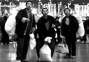 在第三候车室门口,搬运工陈师傅拉着空行李车一过来,呼啦一下围上去二三十人,不到一分钟,行李车上已有近10个大包。陈师傅说,现在一天最多跑40趟。
