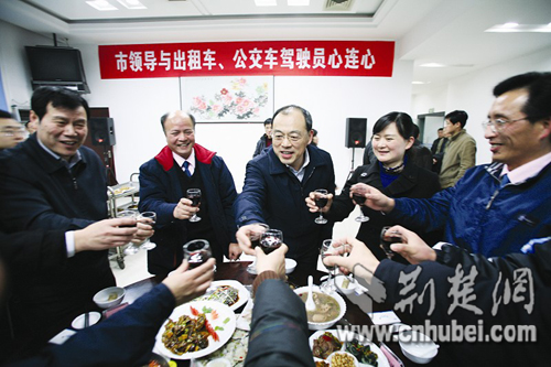 “给全市公交、出租车司机拜年了!”昨日,农历腊月二十八,在出租客管办,武汉市长阮成发请50余名公交车(船)、的士司机吃年饭,共度新春佳节。这是武汉市领导第七个年头请公交、的士司机吃年饭,阮成发连续3次都亲自到场。